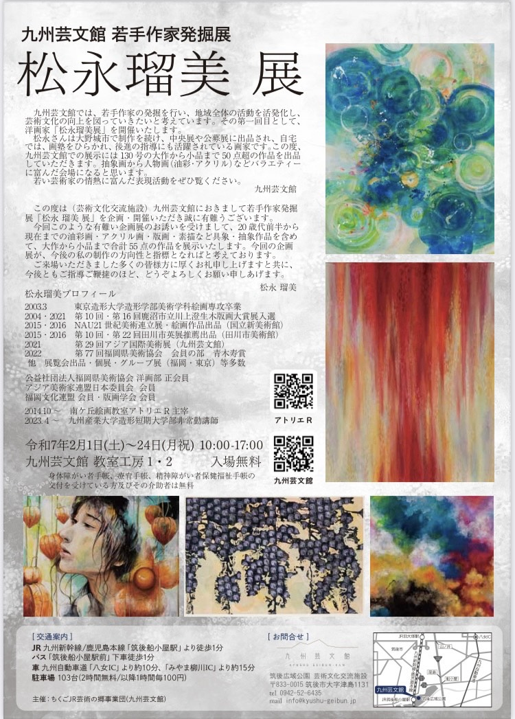 九州芸文館企画による若手作家発掘展 松永瑠美展を開催します。 抽象、具象による油彩・アクリル・版画など55点を展示致します。